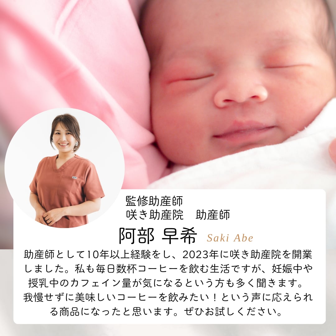 助産師監修のカフェインレスのコーヒーを、手軽に楽しめるドリップバッグです。