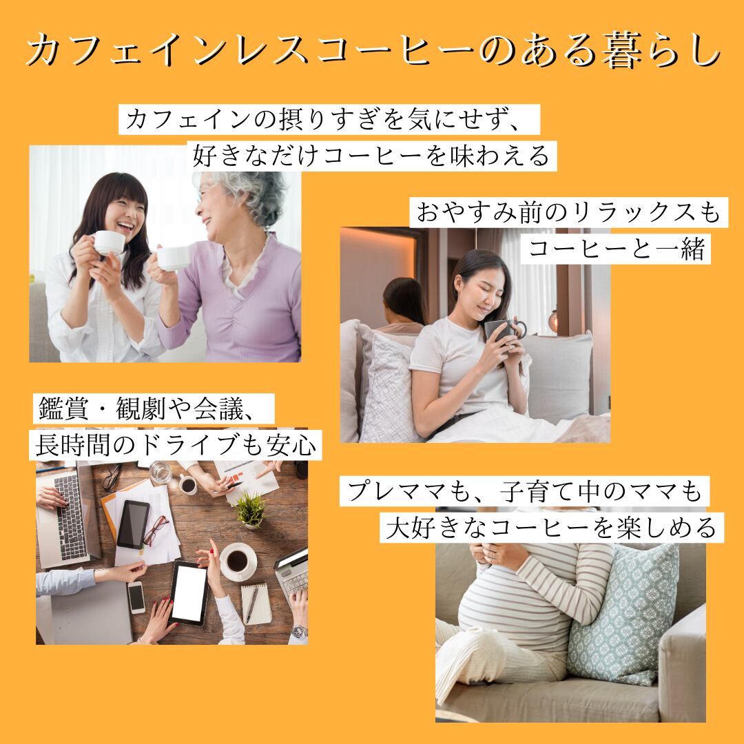 ※このカフェインレスコーヒーは、標高5,500mのメキシコ最大の山“Pico de Orizaba”の天然水を使用した「水抽出法」により薬品を一切使わず含有カフェインの99%を除去しています。